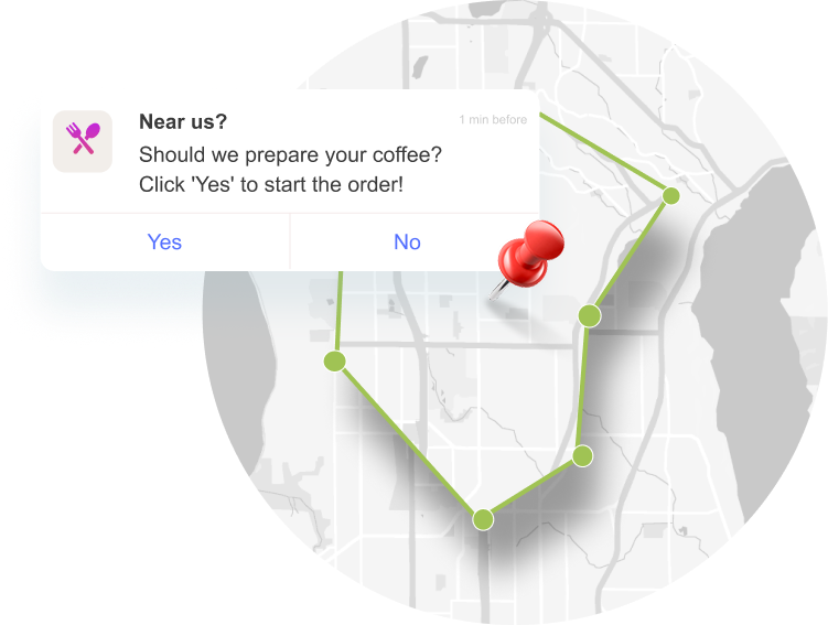 Send push notifications when users enter or exit physical locations. Draw geofences around stores, competitors, or event venues. Customers receive messages automatically when they cross that boundary.